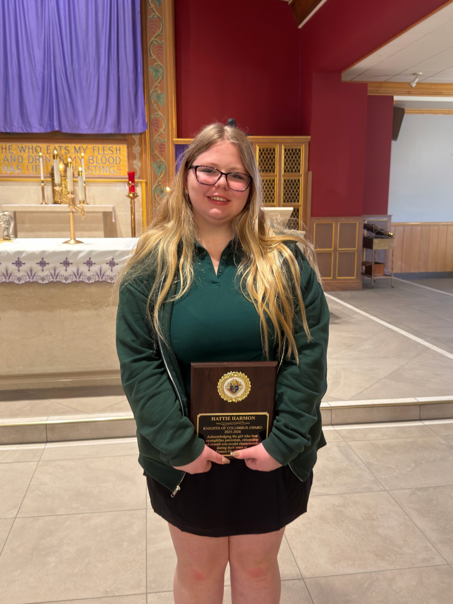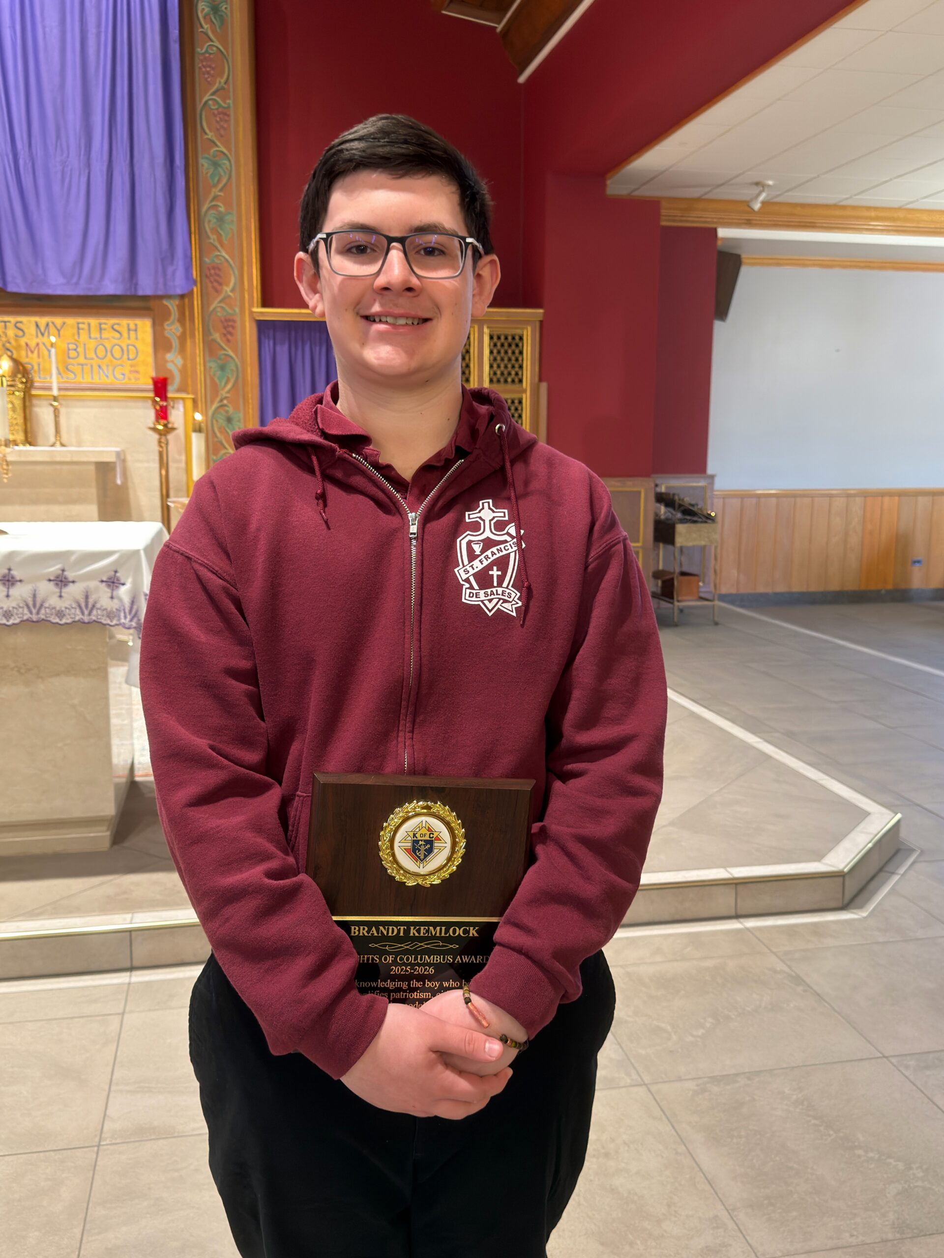 The Knights of Columbus is an organization founded on the principles of charity, unity, fraternity, and patriotism. The core values of this organization include: integrity, professionalism, excellence, and respect. Every year for the past 15 years, our Knights of Columbus has recognized two St. Francis 8th grade students that exhibit these core values. This award is based on longitudinal performance and interactions, as well as how involved the students were in assisting with service projects, their leadership roles, and whether or not they unify their peer group and maintain positive interactions with everyone. The recipients for the 2025-2026 school year are Hattie Harmon and Brandt Kemlock!